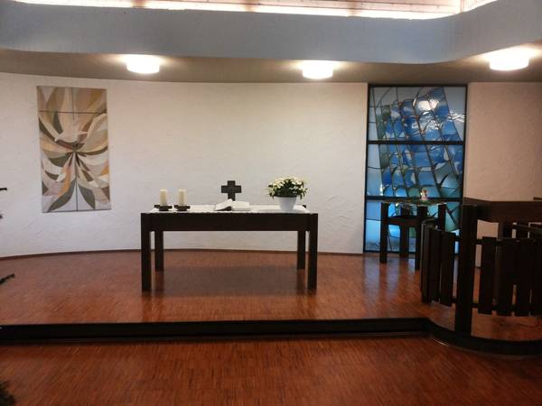Die Wände greifen wie geschwungene Schalen übereinander und öffnen den Raum. Der grobe helle Putz ist wohltuend ruhig für das Auge. Ein Kranz aus Sichtbeton ermöglicht den Blick nach oben. Die beiden Dachteile bilden ein Zelt mit einem Fensterband. So wird das Tageslicht zum Altarraum geführt. Altar, Kanzel, Taufbecken, das Altarkreuz und die Kerzenhalter sind in einfachen, klaren Formen gehalten.